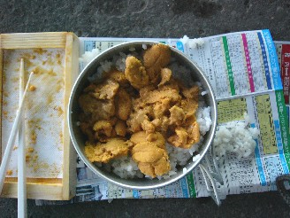 フェリー乗り場近くにある港北防波堤ドームに向かう。野宿をするためだ。キャンプ場があったが、丘の上で行くのが大変だし、ここの防波堤ドームは野宿者には有名なところだからだ。行くとすでにテントがはってある。ここなら雨がふったとしても大丈夫だ。早速テントを張る。そして早速コッフェルで米を炊く。で炊けたら、そのまま放置してスーパーでウニを買ってくる。ウニは1皿1800円稚内産だ。これをコッフェルの中のメシにぶっかける。うに丼の完成だ!