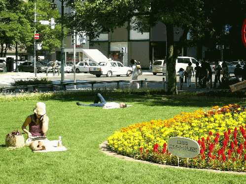 昼間、大通り公園でTシャツとパンツ一丁で芝生のところに思いっきり寝てるやつがいた。すぐ横にズボンを脱ぎ捨てていた。長い間ぜんぜん動かない。その格好はワザとやっているかと思ったが、そいつが急におきたと思ったら苦笑した。で恥ずかしそうにジーンズをはきだした。昨日飲みすぎて、ここにたどり着き。ここを家だと勘違いしてズボンを脱いでしまったのだろうか。寝方も日向ぼっこをするような寝方ではなかった。ここはいろんなひとがいるなあ。札幌の憩いの場だね。この公園には芋やとうもろこしが売っている。