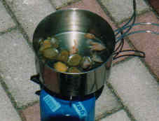 海岸にマツバガイ(名前は後で調べた)がへばりついていたのでこれを折りたたみスコップではがしてみた。こんなん食えるのかしら、まずくないかしらと思いつつ後で食うことにした。この日のメシは、でかいカニは焼いて食い、小さいものは味噌汁のダシにした。味噌汁はマツバガイの身とハゼを入れた。ハゼを炭で焼きハゼ酒「を飲んでみたがまずい。両津港の前の公園で野宿した。テントがないので恥ずかしかった。
