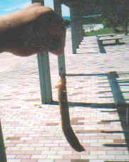 2日目、朝マツバガイの身を釣り針につけてカニがいそうな穴に近づけるとカニが確かに寄ってくる。そこをすかさず捕まえた。そうやってカニを捕まえていると釣り針に大きい引きがあったのであげてみると細長い魚がつれた。最初ウツボの子供かと思ったけど違う。まあ早速味噌汁で食ってみる事にした。相変わらずカニと貝でだしを取り、食ってみたら結構うまい。魚の名前がわからん。