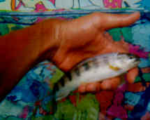アマゴがとれた! 写真はとれたアマゴ。子供の時に比べて、自分の手が大きくなったせいかエゴからアマゴを引き出すのに時間がかかった。10分くらいの格闘。 |